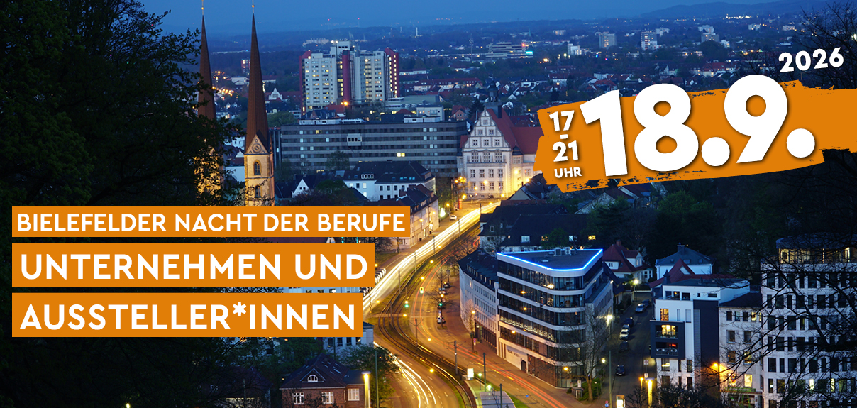 Mit der Bielefelder Nacht der Berufe wollen wir erneut Jugendliche und Unternehmen bei einem abendlichen Event zusammenbringen. Sie bietet ein innovatives, kostenfreies Format der Nachwuchsgewinnung, des Ausbildungsmarketings und der beruflichen Orientierung.